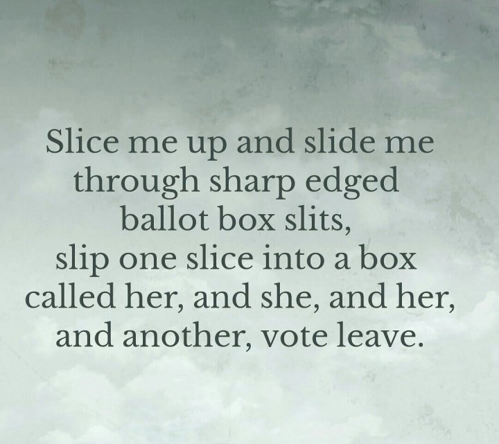 Slice me up and slide me through sharp edged ballot box slits, slip one slice into a box called her, and she, and her, and another, vote leave.