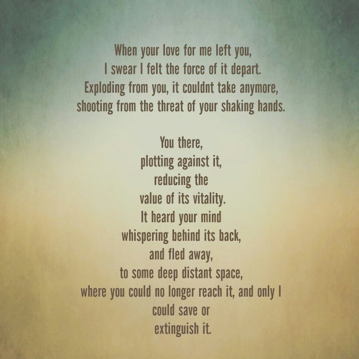 When your love for me left you, I swear I felt the force of it depart. Exploding from you, it couldnt take it anymore, shooting from the threat of your shaking hands.